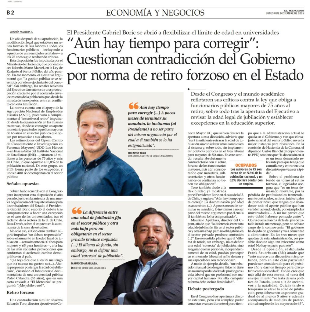 Mauricio Apablaza, director del Cipem, añade que «la diferencia entre una edad de jubilación fija en el sector público y otra más baja pero no obligatoria en el sector privado produce confusión (…)». En ese sentido, plantea que el «dilema de fondo, sin embargo, no es definir una edad ‘correcta’ de jubilación, sino asegurar que las personas, independientemente de su edad, puedan participar en el mercado laboral si así lo desean y sus capacidades son reconocidas».