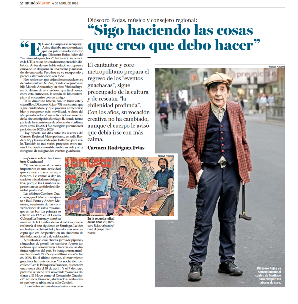 En su diminuto balcón, con un buen café y cigarrillos, Dióscoro Rojas (75) nos cuenta que sigue cuidándose y que procura alimentarse bien y recuperar más movilidad. A fines del año pasado, retomó sus actividades como core de la circunscripción Santiago II, donde forma parte de las comisiones de educación y cultura, entre otras. En 2024 fue reelegido por un tercer período: de 2025 a 2029.