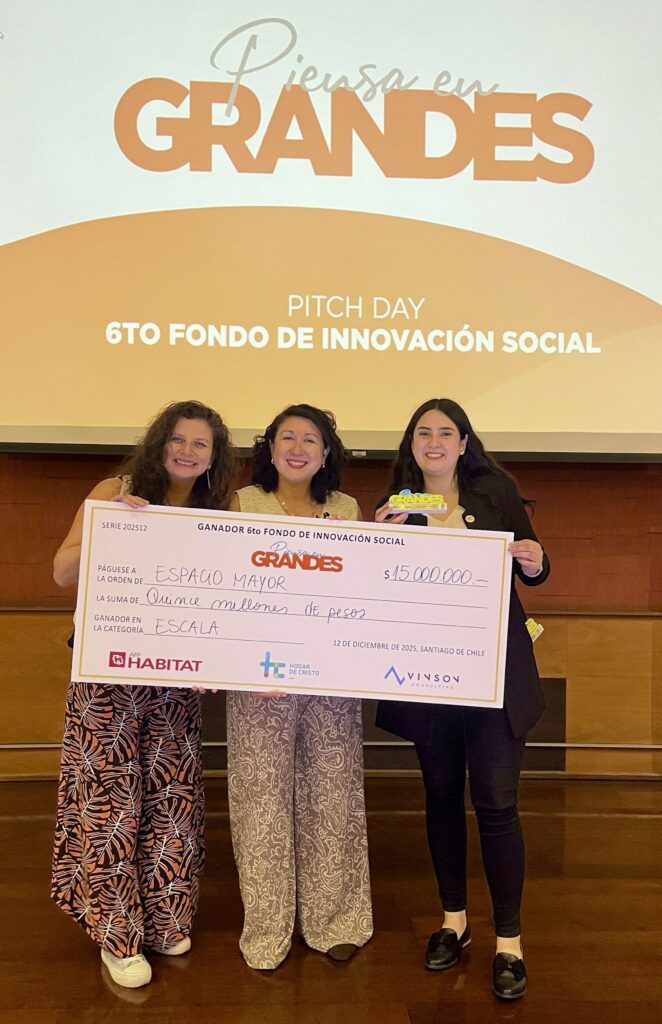El viernes 12 de diciembre se realizó el esperado Pitch Day 2025 del sexto fondo de innovación social Piensa en Grandes, iniciativa de AFP Habitat, Hogar de Cristo y Vinson Consulting. De los 158 proyectos presentados, 15 fueron finalistas, entre ellos la aplicación Espacio Mayor de Conecta Mayor UC, que se alzó como uno de los dos ganadores en la categoría escala.