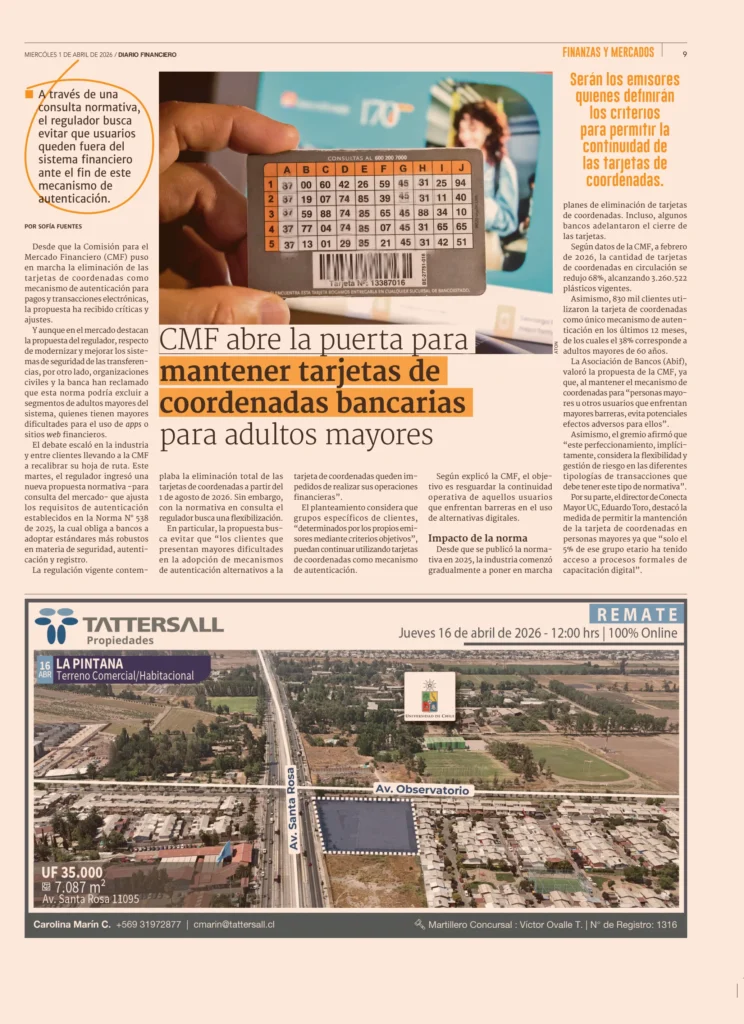 La regulación vigente contemplaba la eliminación total de las tarjetas de coordenadas a partir del 1 de agosto de 2026. Sin embargo, con la normativa en consulta el regulador busca una flexibilización. En particular, la propuesta busca evitar que “los clientes que presentan mayores dificultades en la adopción de mecanismos de autenticación alternativos a la tarjeta de coordenadas queden impedidos de realizar sus operaciones financieras”.