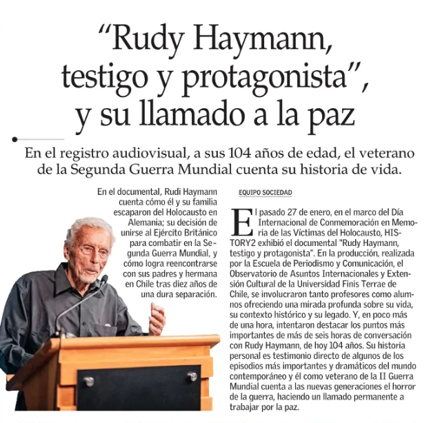 El pasado 27 de enero, en el marco del Día Internacional de Conmemoración en Memoria de las Víctimas del Holocausto, HISTORY2 exhibió el documental “Rudy Haymann, testigo y protagonista”. En la producción, realizada por la Escuela de Periodismo y Comunicación, el Observatorio de Asuntos Internacionales y Extensión Cultural de la Universidad Finis Terrae de Chile, se involucraron tanto profesores como alumnos ofreciendo una mirada profunda sobre su vida, su contexto histórico y su legado. Y, en poco más de una hora, intentaron destacar los puntos más importantes de más de seis horas de conversaciones con Rudy Haymann, de hoy 104 años. Su historia personal es testimonio directo de algunos de los episodios más importantes y dramáticos del mundo contemporáneo y el cómo veterano de la II Guerra Mundial cuenta a las nuevas generaciones el horror de la guerra haciendo un llamado permanente a trabajar por la paz.